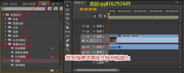 4、然后在“效果”面板里找到“视频特效”-“模糊与锐化”-“残像”,按住残像效果按住并拖拽到视频1轨道的视频上去。只要把特效拖拽到视频中,就一整个视频都会应用了这个效果。