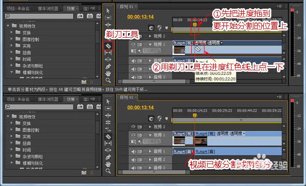 5、如果不想要整段视频都运用这个效果的话,可以通过分割视频来给指定的视频片段添加效果。首先把进度条拖到要分割视频的位置上,接着在工具栏里找到剃刀工具,接着用剃刀工具在进度条红色线上点一下,这样视频就被分割成了两部分了。接着再把残像特效拖拽到要添加这个效果的视频即可。
