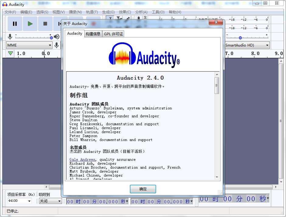 Audacity是免费音频编辑录音软件,同时也是开源软件,软件安装为英文界面,自身为多语含中文版,有软件界面图为证。软件初次启动也是英文界面,需要选择语言为Chinese(Simplified)简体中文版。