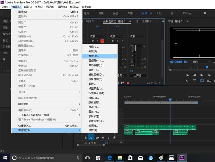 6、另外在后期配音过程中如果有背景音乐及回音,那到编辑栏下的“首选项”里找到“音频”,然后将“时间轴录制期间静音输入”前打上勾。