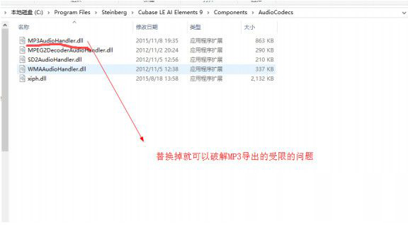 8、 解压 导出 mp3 破解 dll 补丁.zip ,把 \mp3dll\64 的 MP3AudioHandler.dll (“32” 文件内的不用管)替换到去 C:\Program Files\Steinberg\Cubase LE AI Elements 9\Components\AudioCodecs\