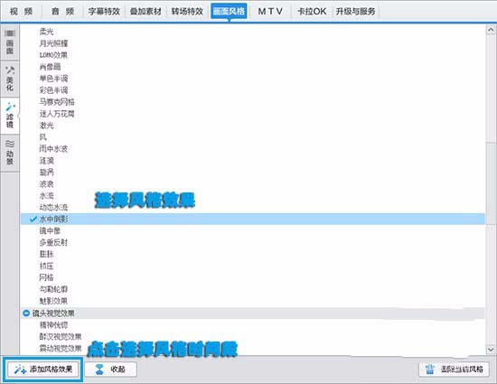 1、“画面风格”面板—滤镜栏,选择水中倒影(选镜中像)。在“画面风格”面板的左下角,点击添加风格效果,可选择为当前片段添加效果或指定时间段添加效果