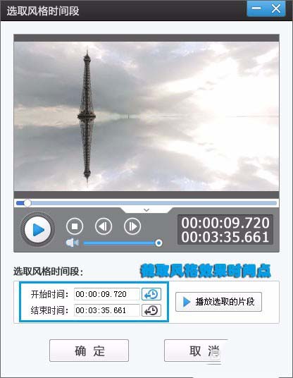 2、为指定时间段添加效果,界面会弹出选取风格时间段对话框。结合左右方向键五秒,上下方向键逐帧,精确定位时间点。点击开始时间和结束时间的拾取按钮。