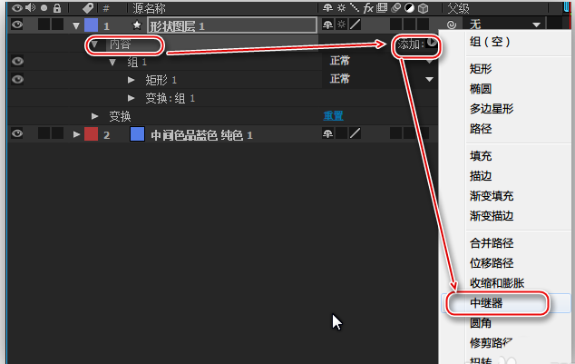 3、将矩形设置成编组。选中“形状图层1”的“内容”属性,然后点击其右侧的“添加”按钮,在弹出的菜单中选择“组(空)”。然后把“矩形1”拖拽到“组1”里面,然后再次选中“形状图层1”的“内容”属性,然后点击其右侧的“添加”按钮,在弹出的菜单中选择“中继器”。
