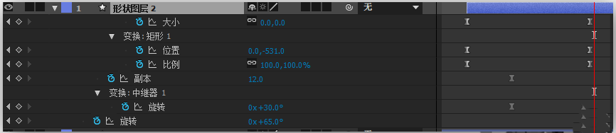 6、选中“形状图层2”,按R键,调出旋转属性,将“当前时间指示器”放到10帧之后,旋转改为45°,并添加关键帧,将“当前时间指示器”移动到1s处,添加65°的关键帧;合上“形状图层2”按UU键展开关键帧,把“中继器1”下的副本改为“12”,然后“变换:中继器1”下的“旋转”属性设置为“360°/12=30°”