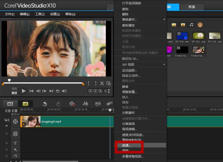 2、在选中视频的状态下,右击鼠标,然后选择变速。