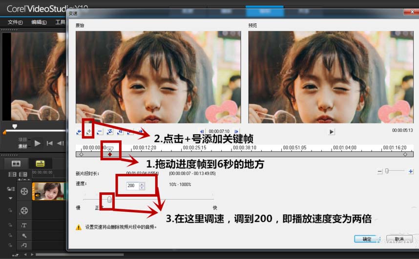 3、选择变速之后,会出现下面的画面,如果我们需要在视频0~6秒的地方让视频播放速度逐渐变为两倍,那就拖动进度帧到6秒的地方,点击+号添加一个关键帧,在调速的地方把速度调为200,然后点击确定