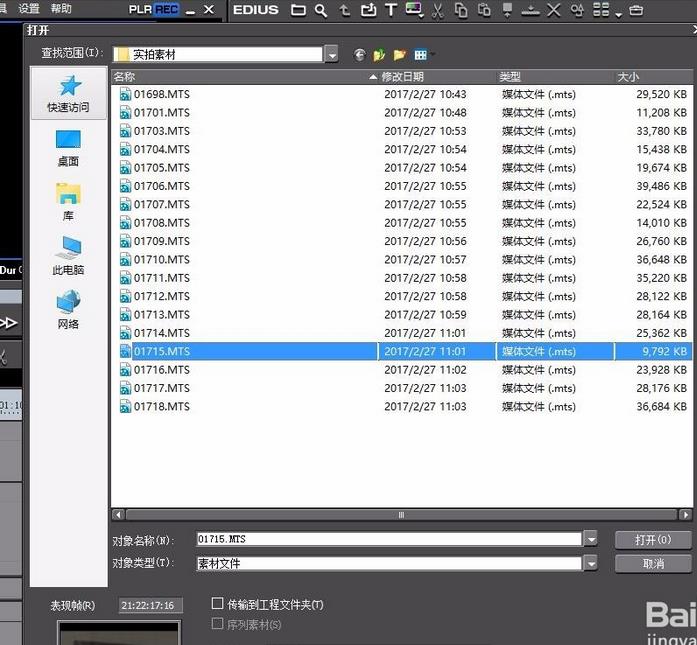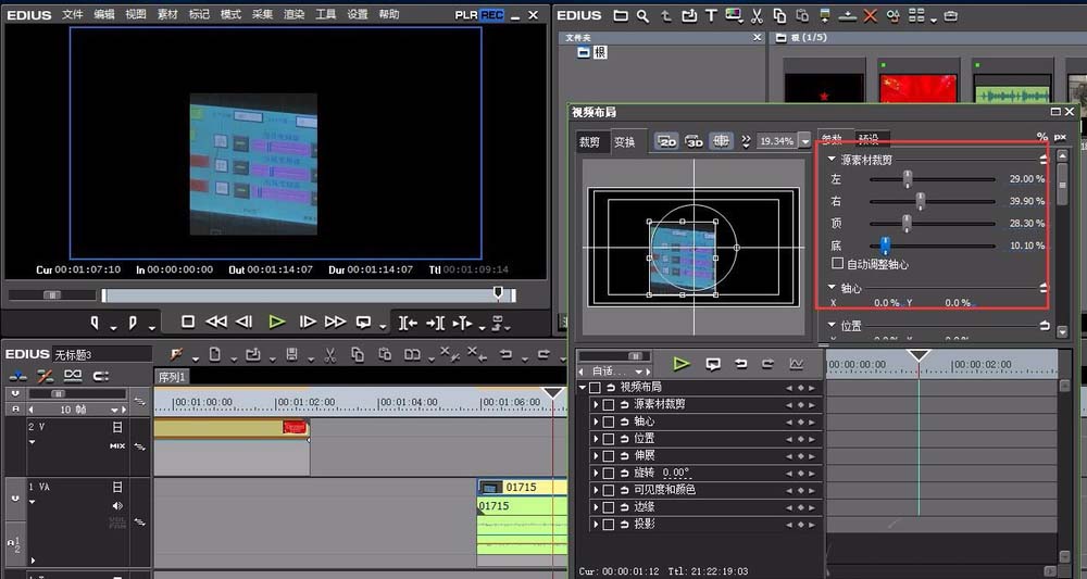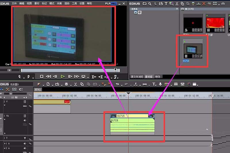3、在EDIUS的素材库中,导入我们需要裁剪的视频。导入的视频素材拖入到时间线上。