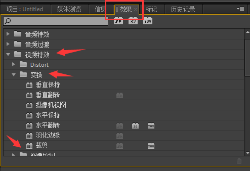 6、选中效果面板中-【视频特效】-【变换】-【裁剪】。将裁剪特效拽到到视频2上的,过渡字幕上。