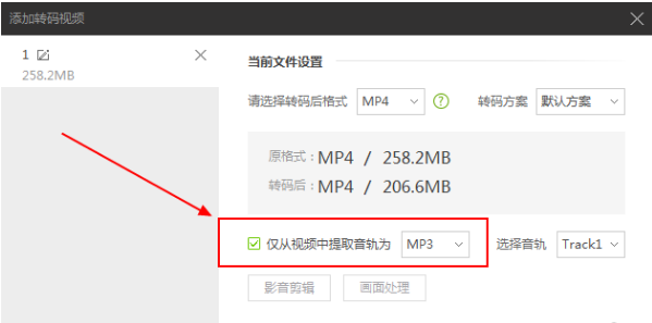 2、添加好后会出现下图窗口,在这个窗口中勾选上“仅从视频中提取音轨”,必须要勾选上它!勾选后在选择一下提取音频的保存格式;