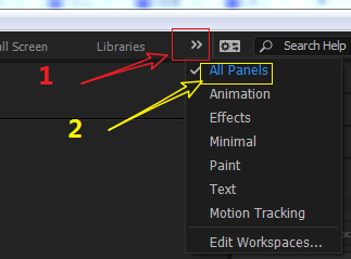 3、可是按原来的解决方法不行,没有预览控制台,我尝试了其他的解决方法点击 ”库“右边的“》”出现10多个选项,鼠标点击“所有面板”。英语版的同理也是