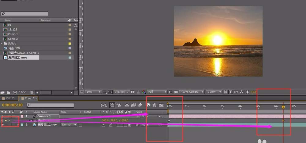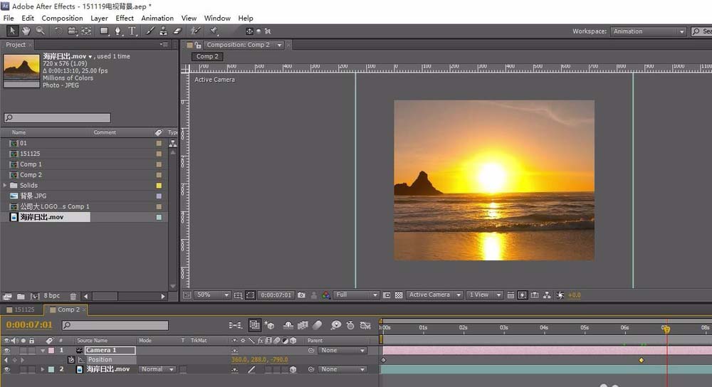 4、在摄像机的位置属性上加上关键帧,只要改变其Z轴属性,先在开始的点添加关键帧。