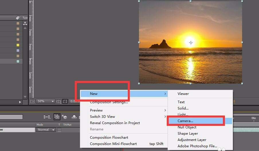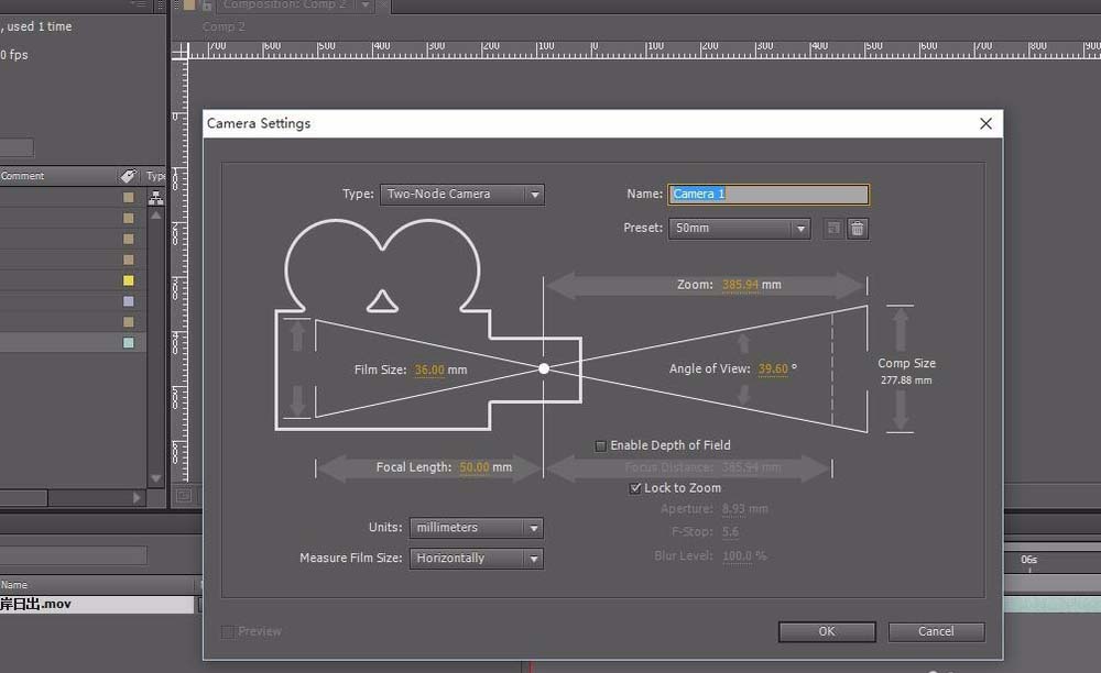 3、新建一“摄像机”原件,摄像机的各个参数保持默认即可。