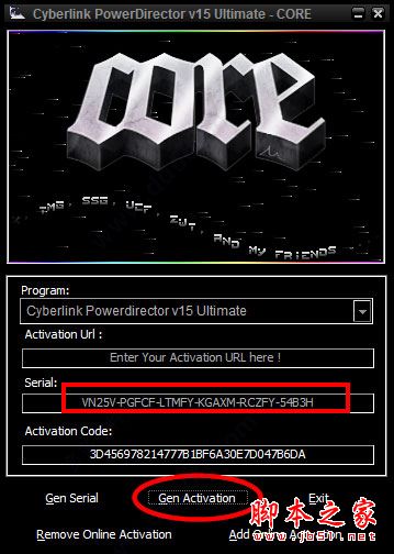 4、安装完成后先不要运行,运行威力导演16注册机,在序列号中输入:VN25V-PGFCF-LTMFY-KGAXM-RCZFY-54B3H,点击“Gen Activation”