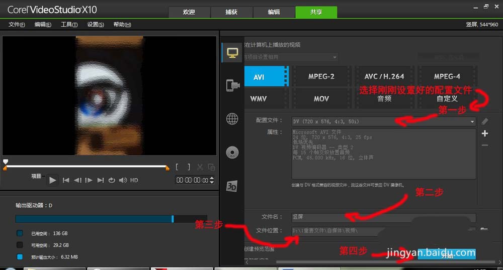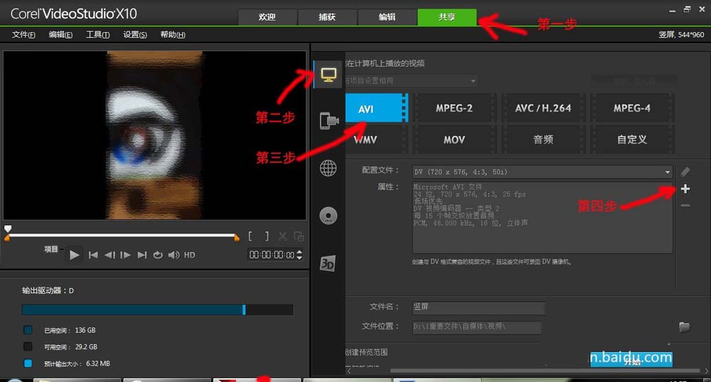1、请按照图中的步骤,进行先后顺序的操作,强调一下,需要选择avi格式的,第四步,选择加号,
