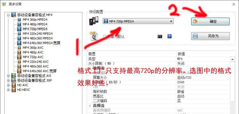 7、然后选择转换格式,格式工厂最多支持720p的,选择图中的设置,效果会比较好,