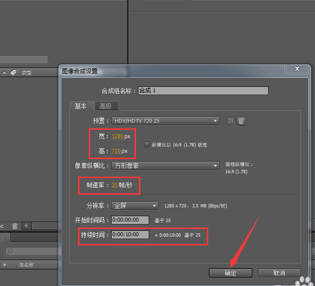 1、新建一个合成,大小1280x720.帧速率25帧,持续时间10秒.在新建个固态层。