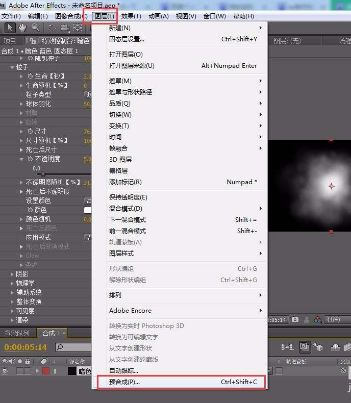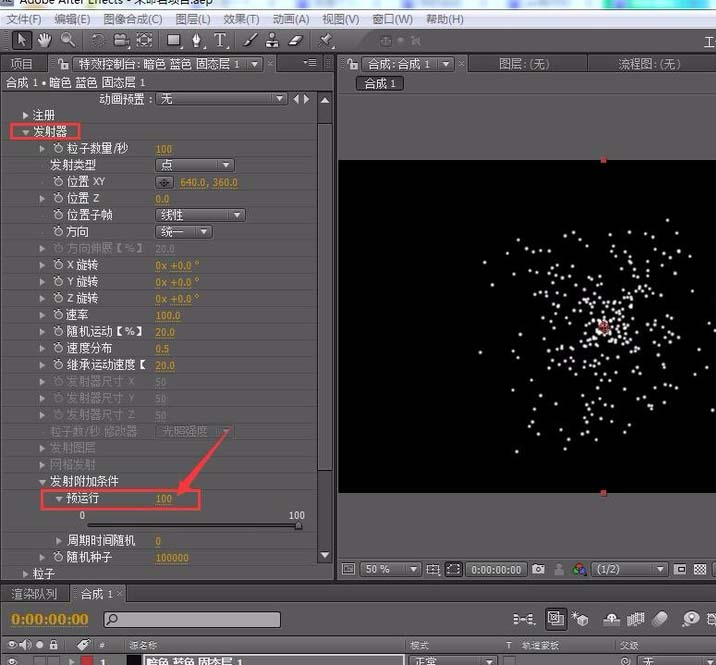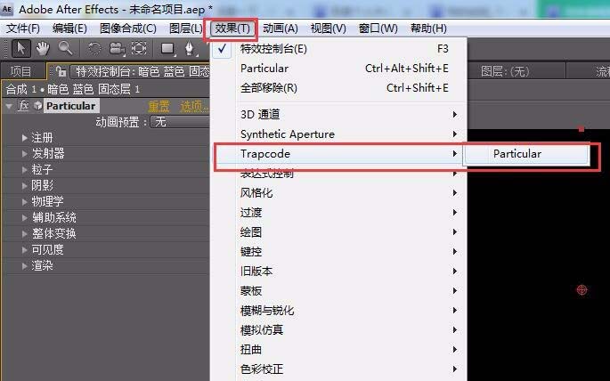 2、点击效果,选择Particular粒子插件。在调节它的属性,点开发射器,选择预运行设置为100.