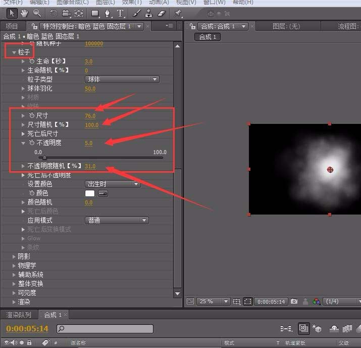 3、将粒子尺寸设置为70左右。将尺寸随机设置为100.将不透明度设置为5.不透明度绥靖设置为30.以上参数均可目测调节。现在这个云朵应经初步形成,可制作成有远方飘到近处效果,不过云的自身运动较大。
