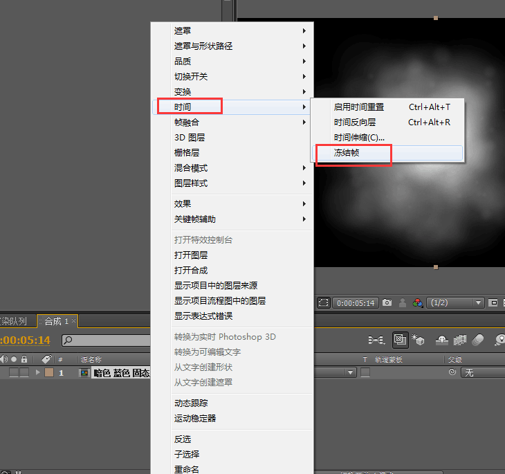 5、右键点击预合成图层,选择时间,选择冻结帧。这时我们的云就没有任何动作了。
