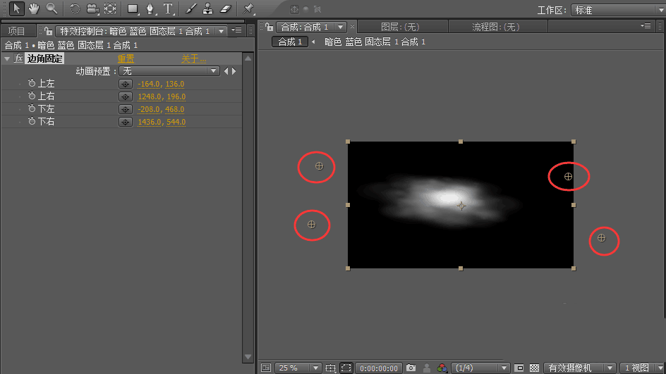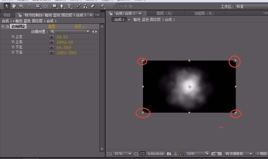 6、点击效果,选择扭曲,选择边角固定。我们可以将边角固定的4个点进行随意拖拽,调节出我们所想要的形状。也可以打上关键帧做动画。如图。