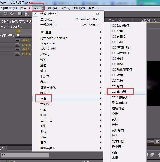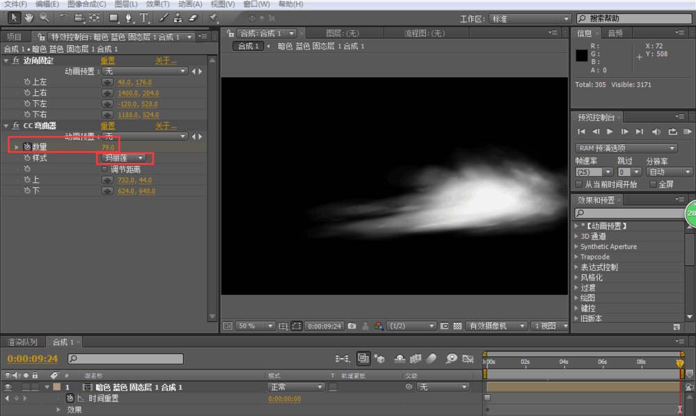7、还可以添加cc弯曲器做云的运动,不然云有些死板。点击效果,选择扭曲,选择弯曲器。将数量起始帧打上关键帧,将样式设置为玛丽莲。结束帧设置为70-80。好了我们可以预览一下。云已经做好了。