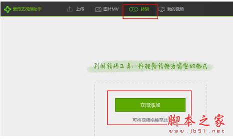 1、打开爱奇艺视频助手,然后在其界面打开“转码”功能,接着点击“立即添加”按钮,并在弹出的窗口中将想要裁剪的视频添加进来,或者也可以直接将视频拖动到该界面进行添加;