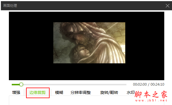 3、在“画面处理”界面的“边缘裁剪”中就可以裁剪视频了,通过调整上下左右边缘来裁剪视频,如下图所示: