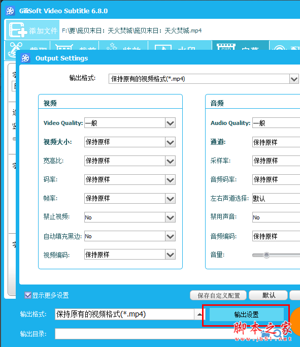 5、选择输出设置,按自己的要求设置视频输出大小和格式。我这里设置是保持原样。