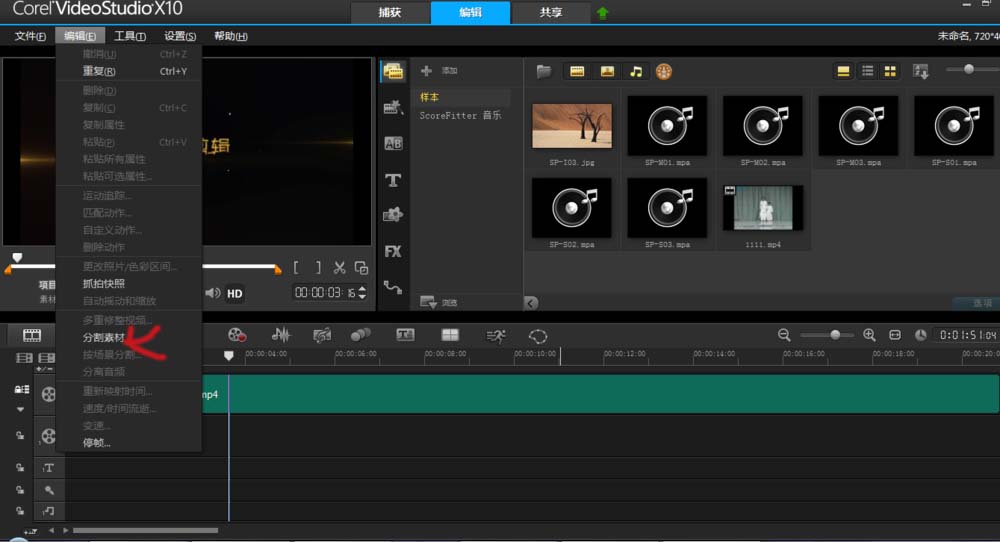 3、拖动到你想要剪辑的地方以后,点击【编辑】-【分割素材】,视频就会分割成为2个部分,你多移动几次,重复步骤2和步骤3,就可以把一个视频分割成为几个视频片段