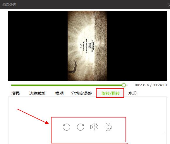 3、之后在“画面处理”界面的“旋转/翻转”中就可以调整视频画面了。在这里根据视频自身情况点击对应的旋转角度即可;