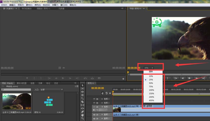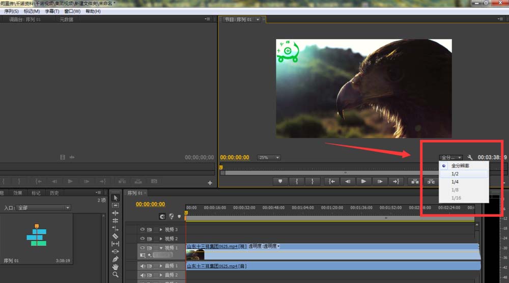 6、在premiere视频编辑框中预览中可以看到,右下角附件有分区显示,如图所示: