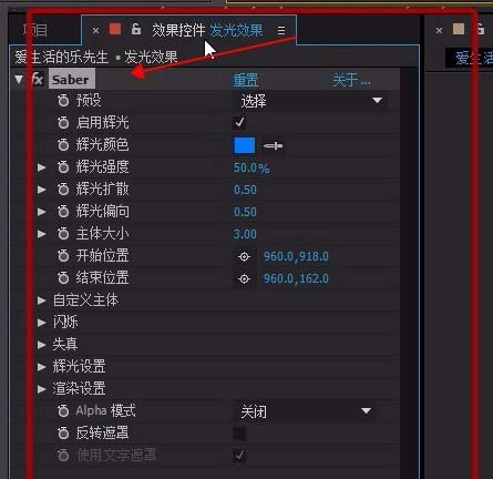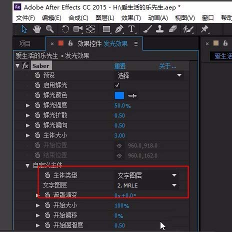 3、效果控件--Saber-自定义主体, 主体类型-文字图层,文字图层-选择新建的文字层