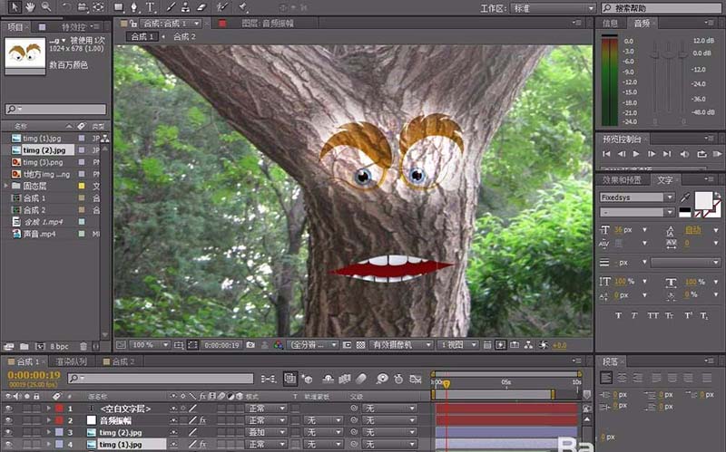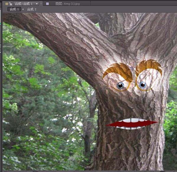 7、好了现在预览一下,树的嘴巴已经配合声音开始说话了。最后把眼睛图片拖至第一层调整大小和模式,再把牙齿合成拖放到最后一层,调整合适大小。好了我们的图片说话已经制作好了。