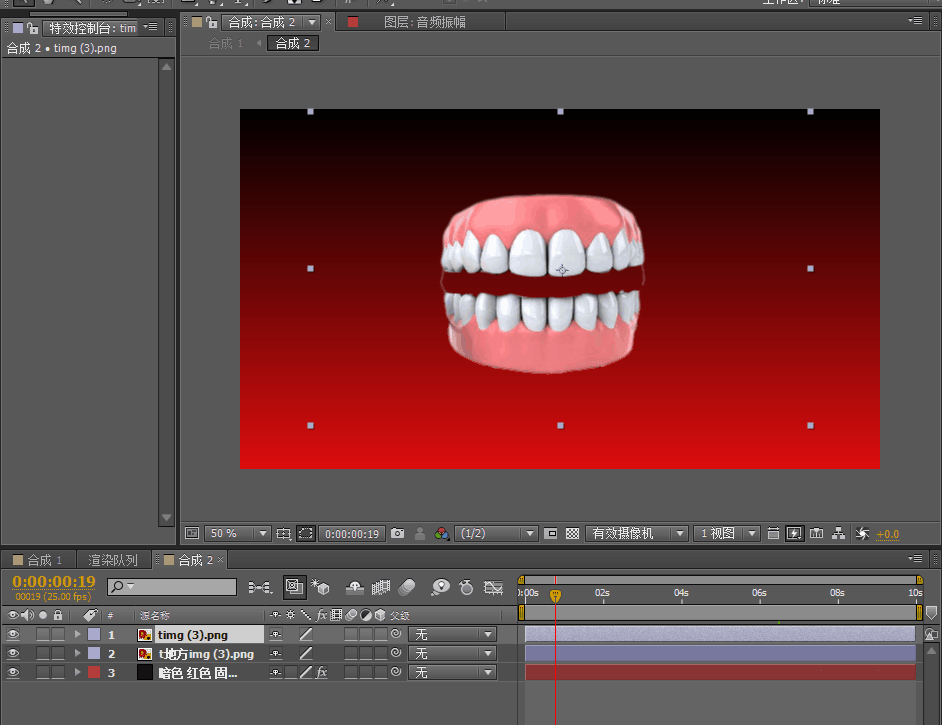2、将图片与声音全部导入AE中,新建一个合成,新建一个固态层暗红色,先将2张牙齿放到一个合成中备用。