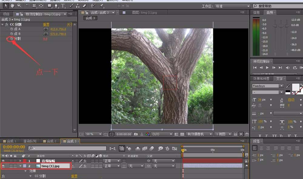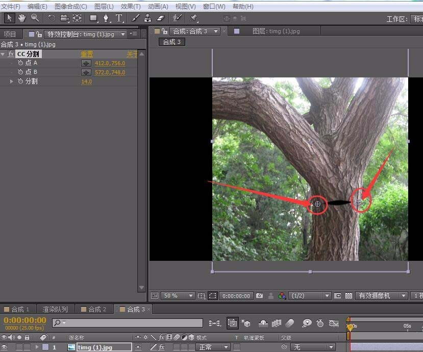 3、在新建第二个合成,将树的图片拖进来。再给树添加一个分割效果。点击效果/扭曲/分割。将分割的AB两个点分别放置开口部分,如图所示。 这是我们改变分割参数,发现树已经开口了。