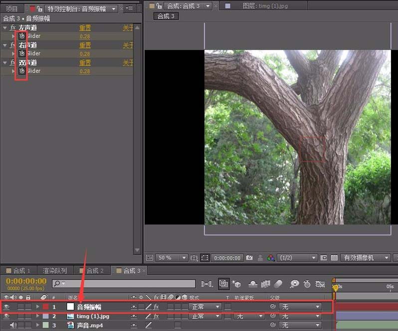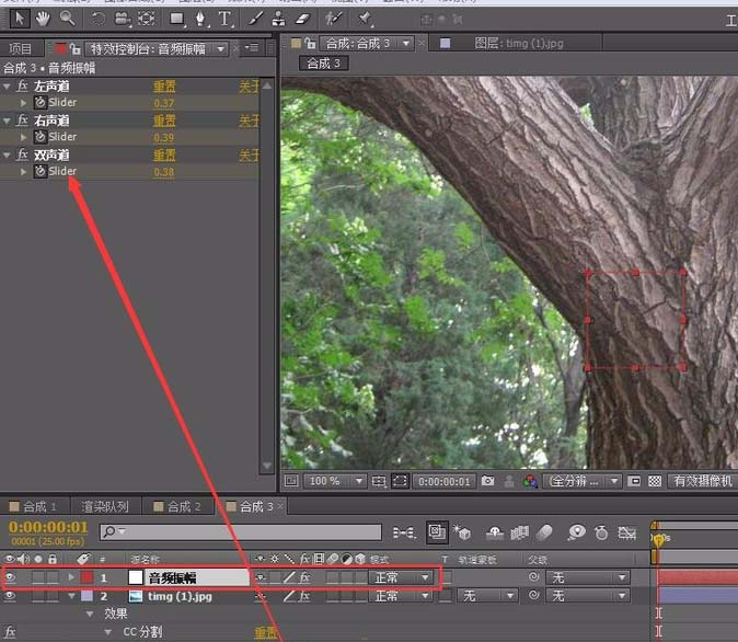 6、再选择第一层音频振幅层,用鼠标左键按住分割曾德表达式拾取,就是像蜗牛的那个图标,连接到第一层参数的双声道那里。如图所示。