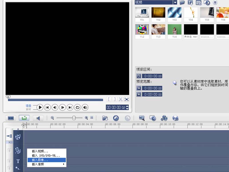 1、首先启动会声会影10,切换到覆盖菜单,在覆盖轨道上右键单击从下拉菜单中选择插入图像选项。