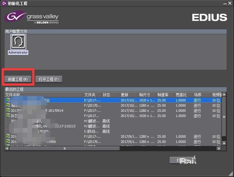 1、首先就是下载安装至少7版本以上的EDIUS,在7之前的版本里面是不能建立4K工程文件的。打开之后,在初始化工程截面,我们一定要选择“新建工程”。