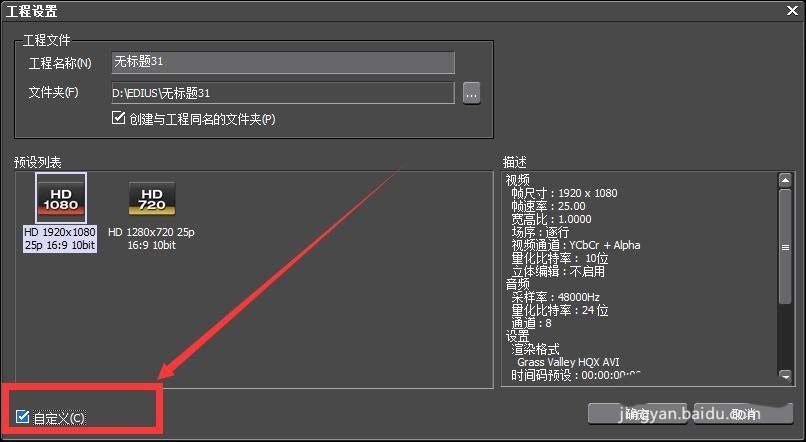 2、在接下来的“工程设置”里面,有一个很重要的“自定义”,勾选上,然后点击确定。