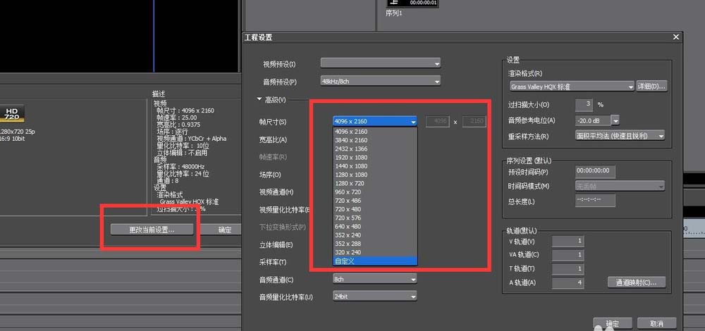 6、在“工程设置”里面进行“更改当前设置”,调整帧尺寸即可。