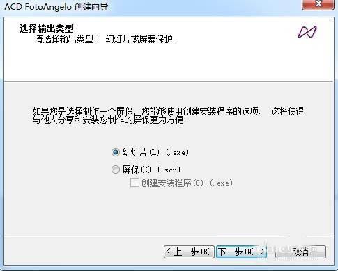 5、创建后,在弹出的创建向导中单击下一步就行了。但需注意,每一步的创建,特别是第二步,选择时候一定要注意,不要选择幻灯片,而是屏保,第三项图像大小的选择尽量选择不要将图像变形的分辨率选项,然后就是保存路径及文件名的设置。