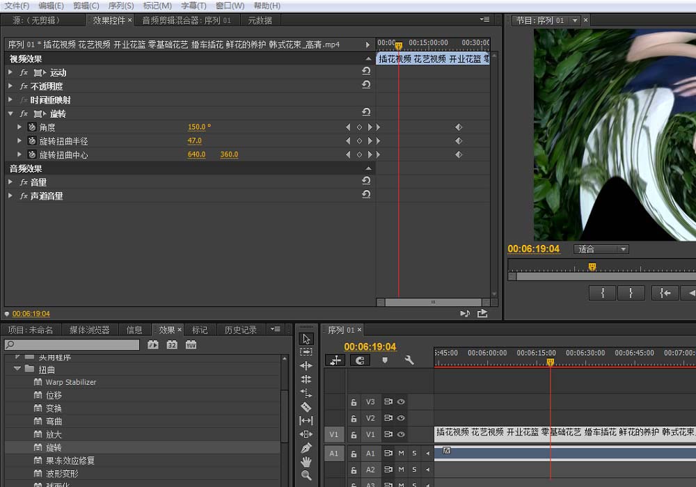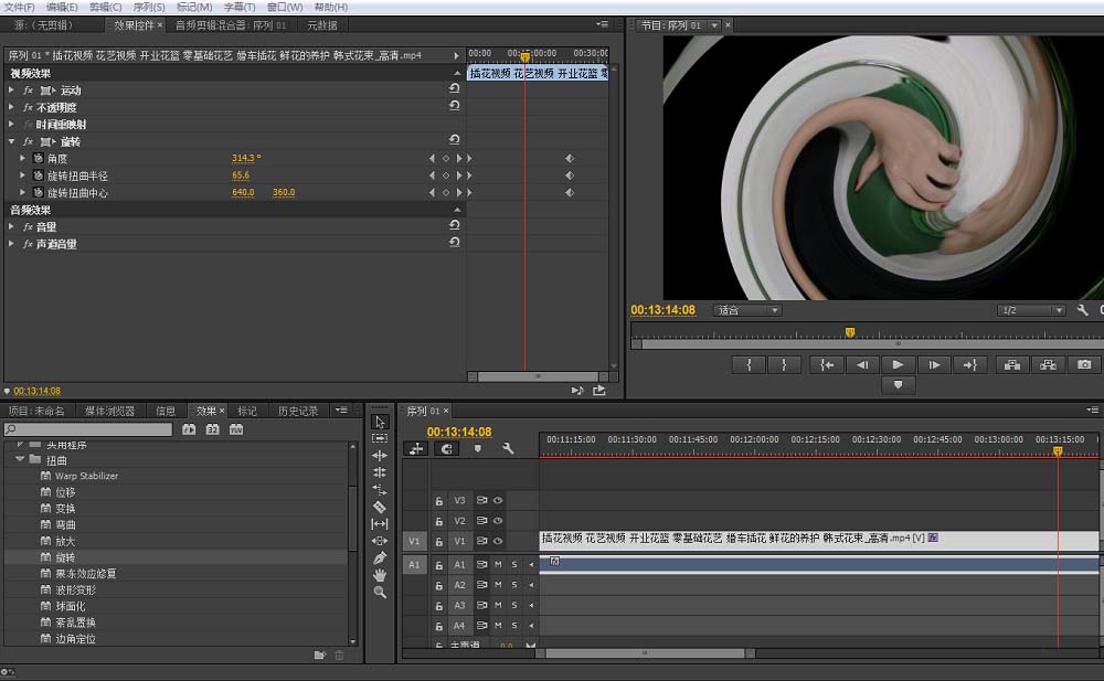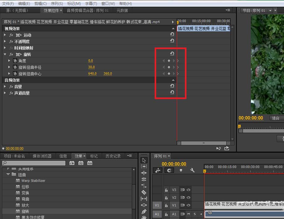 3、激活效果面板,将扭曲效果添加到视频素材上。