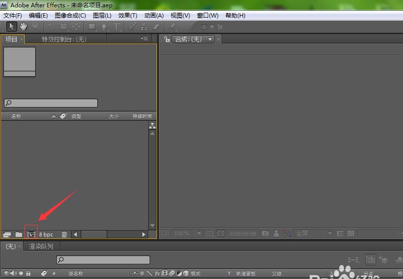 1、打开ae软件,点击下面的新建项目按钮,新建一个项目。