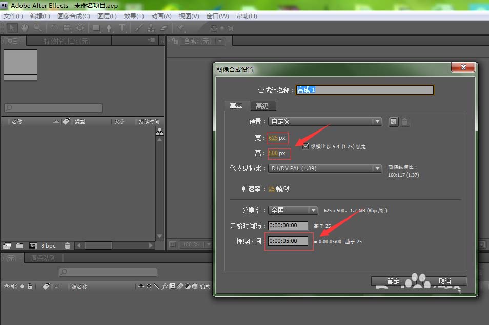 2、建立宽625 长500 帧速率25帧 持续时间5秒的项目,这个没有硬性要求,根据个人需要建立。