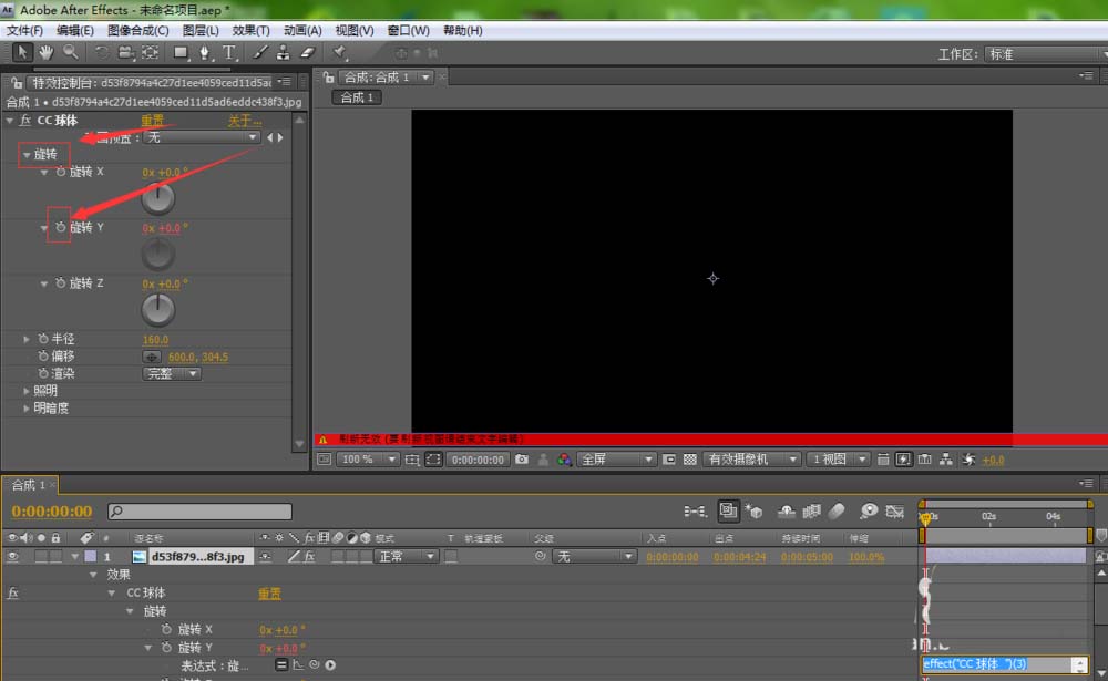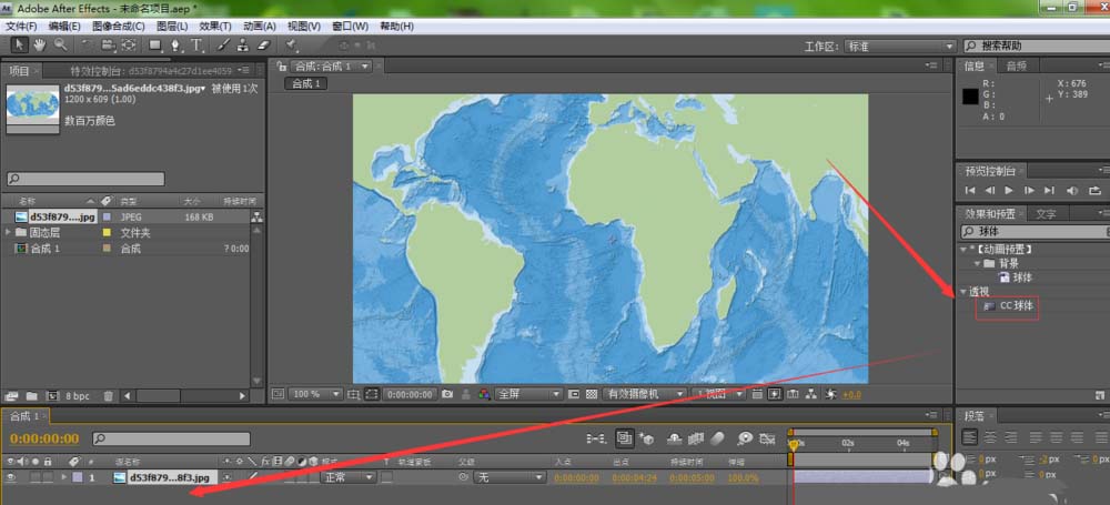 5、导入后可以看到就是这样的一张图片,在右边的特效栏选择cc球体这个特效, 并拉到项目的图片处。