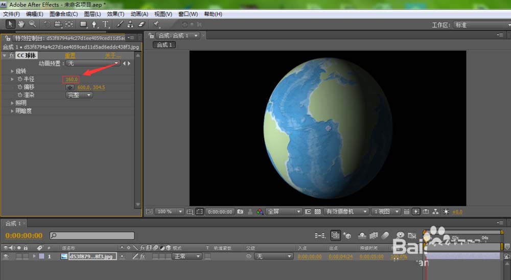 6、可以看到已经变成球体了,把半径200改成160,让图片适应一下页面,这样比较好看。