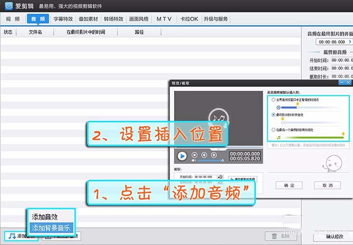 1、在“音频”面板点击“添加音频”—“添加背景音乐”,选择、导入就可以啦,在“预览/截取”框的右侧可以设置插入位置。