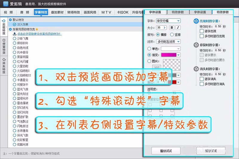 2、在“字幕特效”面板,双击预览画面,在弹出框中输入字幕的内容,字幕就添加成功啦,预览画面的左侧列表中有丰富的字幕特效,选中字幕,双击特效即可使用。在界面的中央有“字体设置”和“特效参数”两个选项卡,可以对字幕的字体、大小、颜色还有时长等等随意设置。