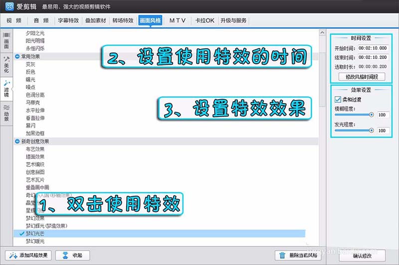 1、在“画面风格”面板,点击“滤镜”左侧栏,然后在列表中选择“曝光”、“梦幻光芒”等效果,双击即可使用。然后在界面中央,可以设置效果的时长和效果。